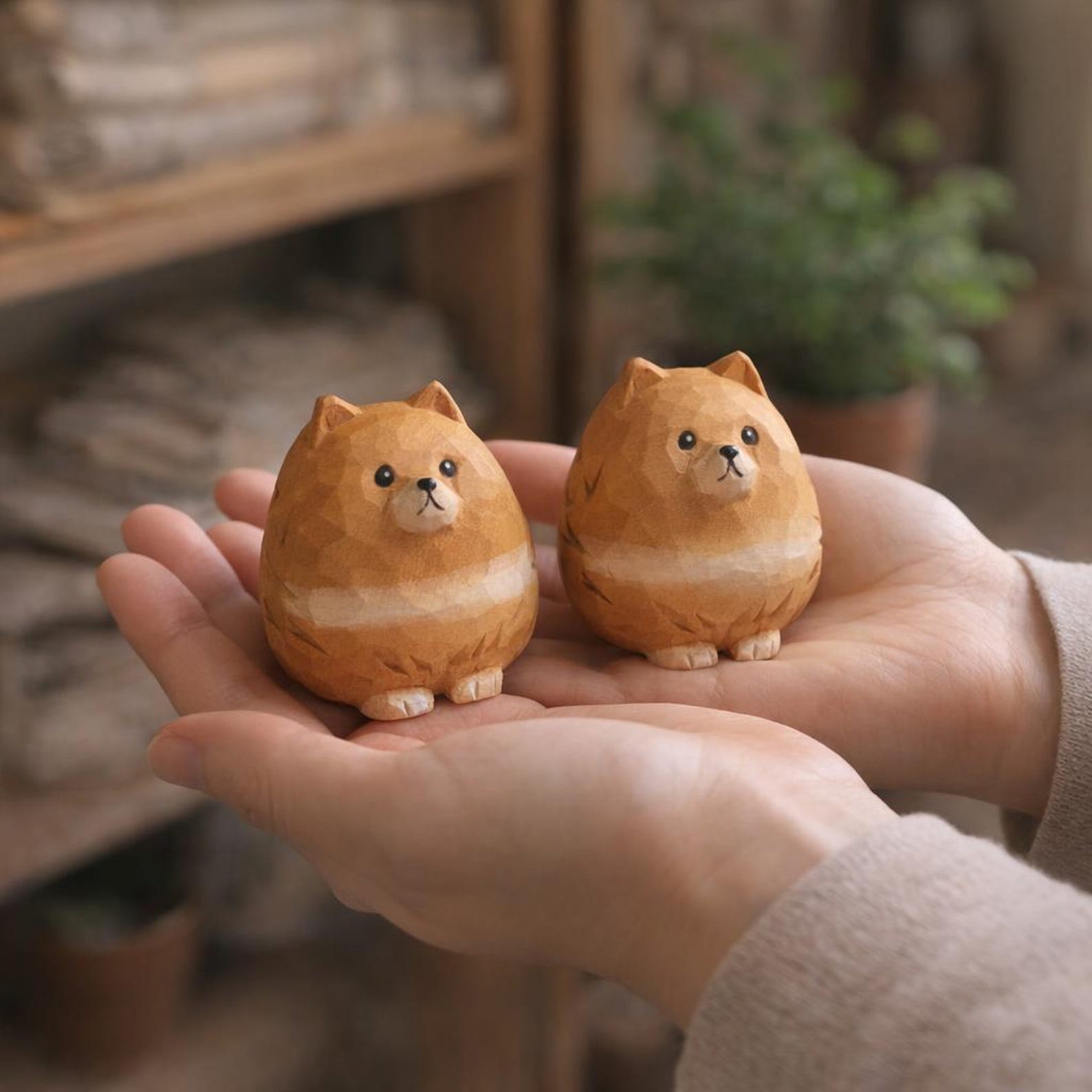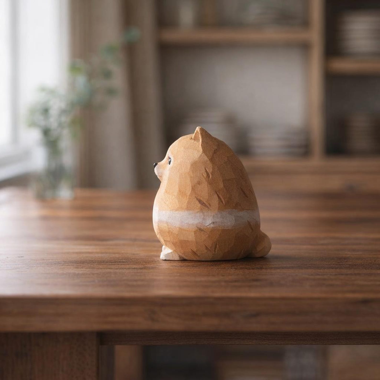 Hand-carved wooden dog figurine with painted face details and a warm natural wood finish. Suitable for bookshelf, desk, and nightstand display. Each figurine is individually carved — natural variation in wood grain and painted detail between pieces is expected. A cozy decorative accent for dog lovers and animal-themed home decor.