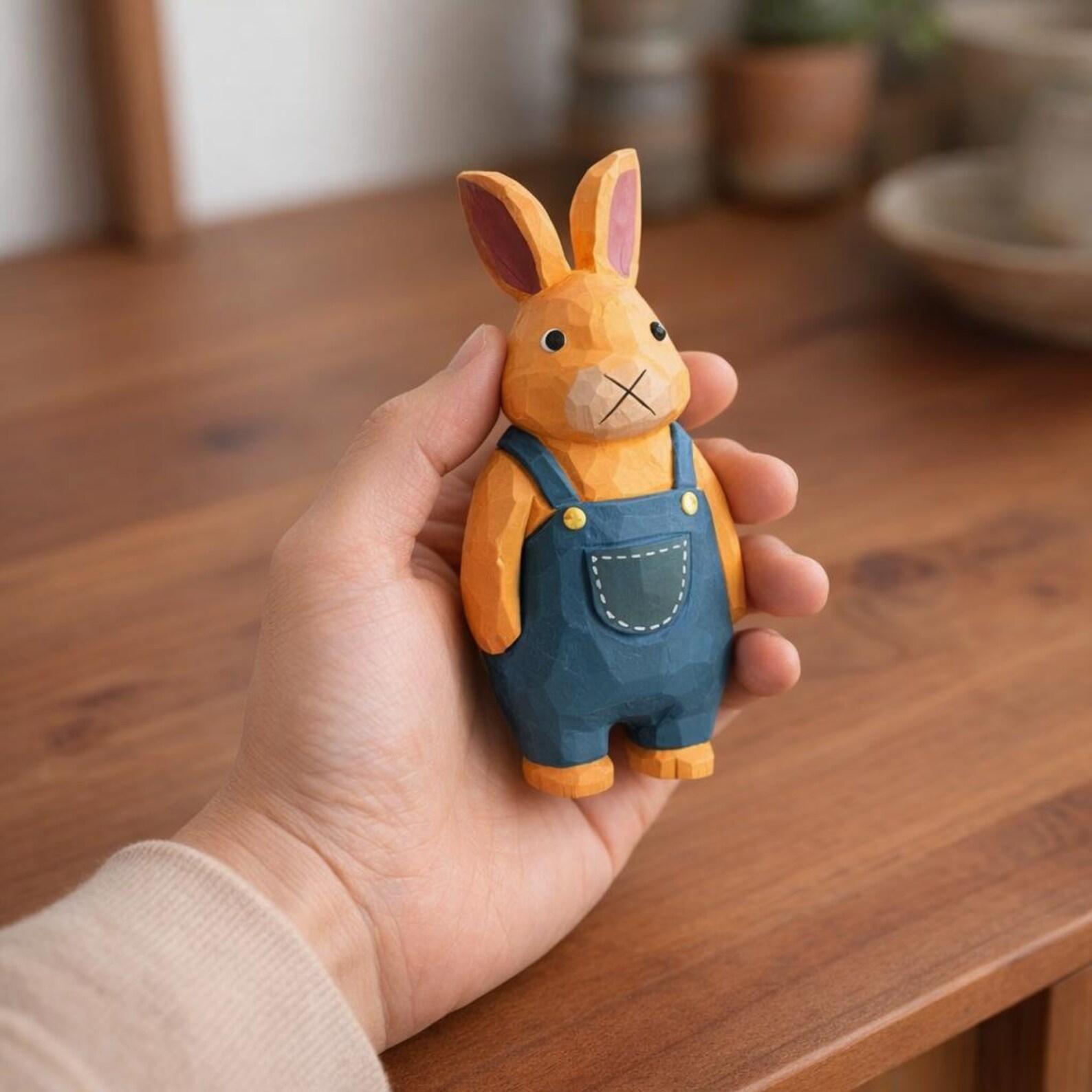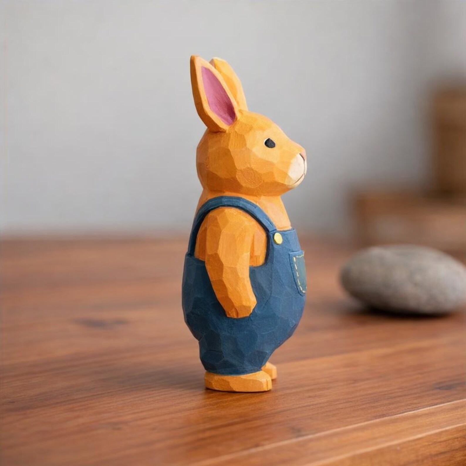 Hand Carved Wooden Bunny Figurine – Natural Wood Rabbit Statue for Desk and Home Decor